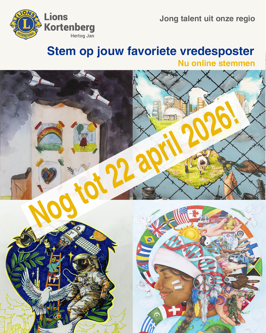 Met de Lions Vredesposterwedstrijd nodigen we jongeren uit om hun droom van vrede creatief in beeld te brengen. Het thema van dit jaar is: “Vier het leven, leef in harmonie.” Ontdek de wedstrijd, bewonder de inzendingen en stem op jouw favoriete vredesposter.